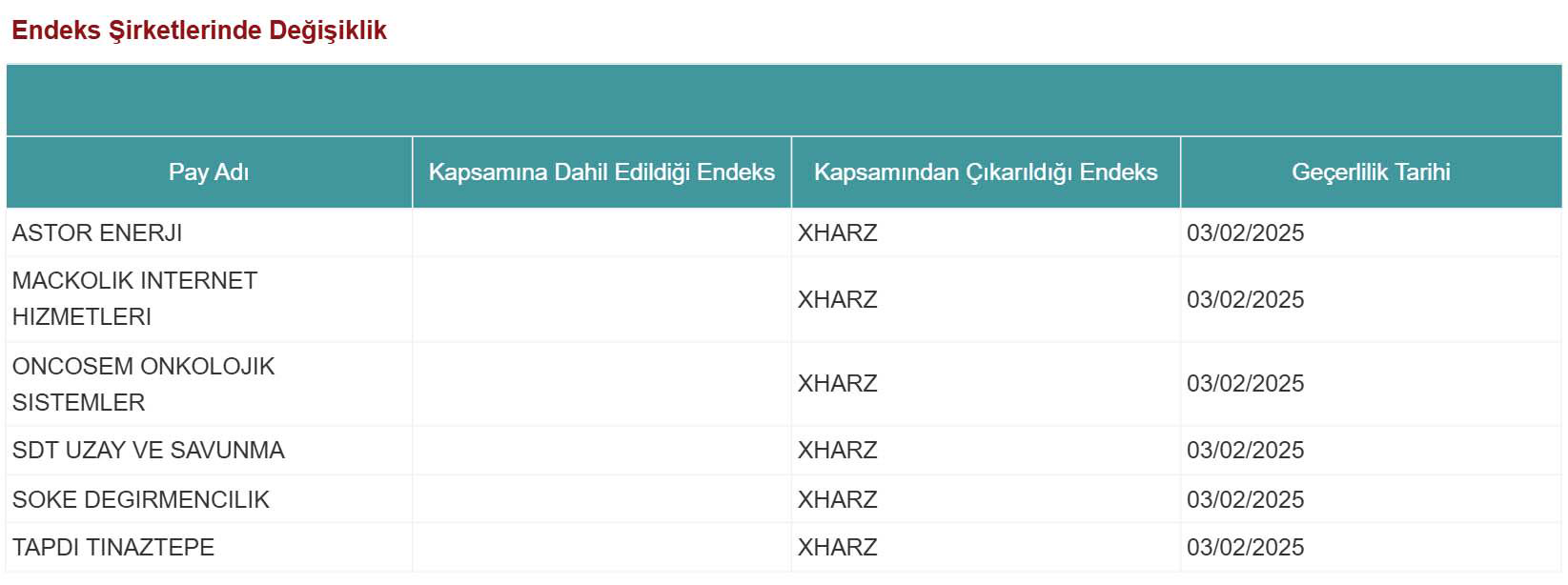 Kamuyu Aydınlatma Platformu’ndan (KAP) yapılan duyuruya göre, 3 Şubat 2025 tarihi itibarıyla endeksten çıkartılacak olan şirketler şu şekilde: